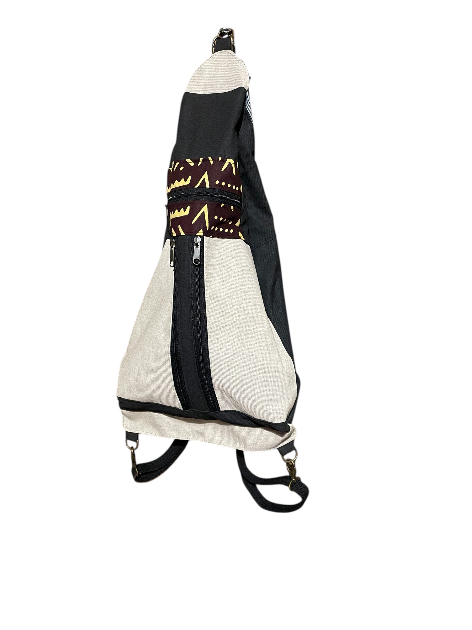Confeccionada artesanalmente en nuestro taller en Asturias, mezcla saco de café reutilizado, denim y tela Wax africana para ofrecerte una pieza única y sostenible.